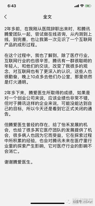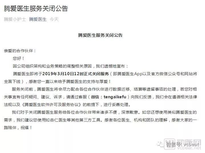 2016年3月,腾爱医生携张强医生集团、冬雷脑科医生集团等9大医生集团杀入医疗行业。一时间,腾爱医生成为改善医患关系的代名词。而就在昨天,腾爱医生在一则官微信息中,结束了自己短暂的“职业生涯”。