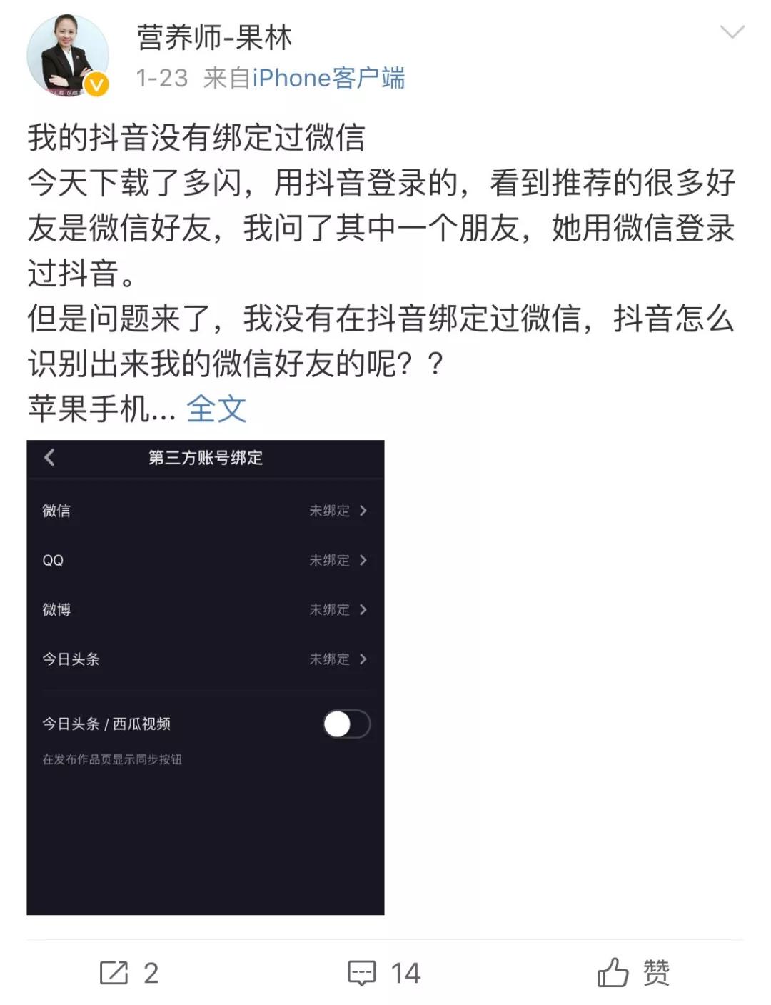 随后,有媒体援引微信内部人士称,抖音新用户登录不可用,是基于保护用户体验及用户隐私安全的考虑,抖音向用户推荐的“可能认识的人”大都来自微信好友列表。
