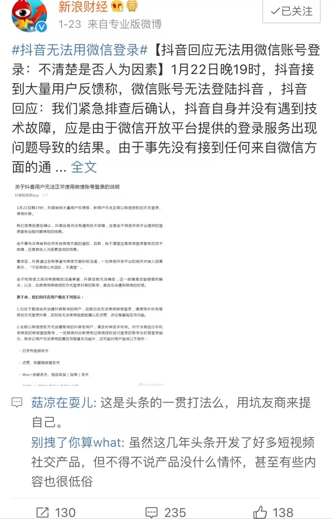 近日,抖音方面发布消息称:“1月22日晚19时,抖音接到大量用户反馈称,新用户无法正常以微信授权的方式登录抖音。经紧急排查后确认,抖音自身并没有遇到技术故障,应是由于微信开放平台提供的登录服务出现问题所致。”