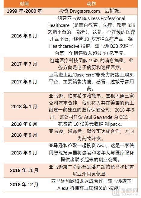 医疗行业对亚马逊的吸引从其一开始建立就存在,最早在1999年到2000年,亚马逊就向Drugstore.com进行了投资,计划将其电子商务业务扩展到药店领域。但最终因为中间商、监管机构等原因,它的雄心壮志戛然而止。