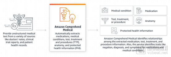 亚马逊在2018年11月27日公布了Amazon Comprehend Medical产品,该产品使用机器学习模型来准确、快速地识别医疗信息,如医疗条件和药物,并确定它们之间的关系,例如药物剂量和强度。使用者可以通过简单的API调用访问产品,无需机器学习专业知识,无需编写复杂规则,也无需培训模型。主要面向的是医院客户,降低医疗文件处理成本,快速准确地从医疗记录中提取信息。
