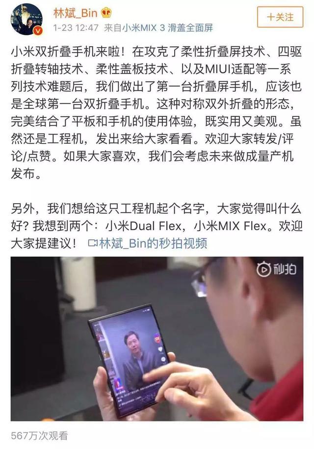 1月23日,小米总裁林斌发布了一条微博,宣布小米做出第一台折叠屏手机,应该也是全球第一台双折叠屏手机。