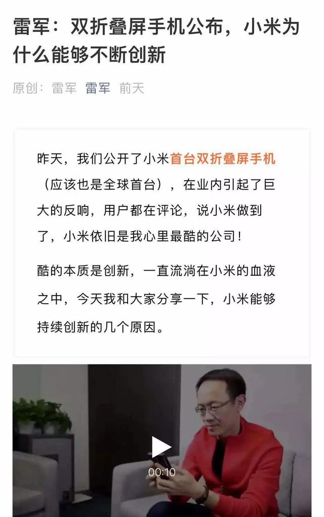 第二天,小米创始人雷军在自己的公众号发布了一篇《双折叠屏手机公布,小米为什么能够不断创新》,讲述了小米的创新之路。
