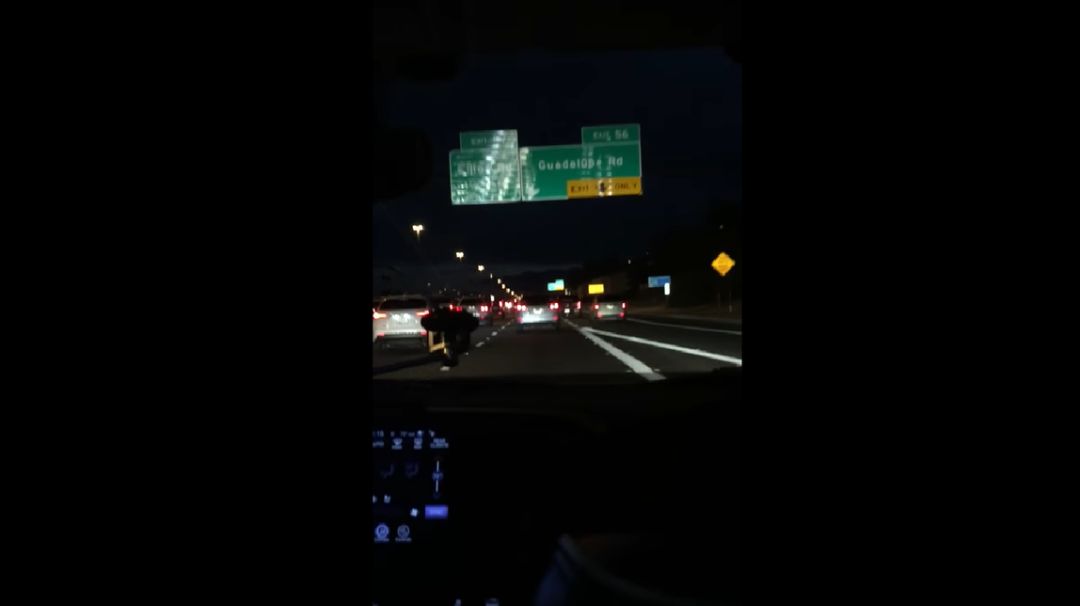 但是在我们的采访结束后,他给我发了他最近一次夜间出行的视频——在自行车爆胎后,他坐车从 US-60 驶上了 Loop 101(两条都是高速公路的标号)。