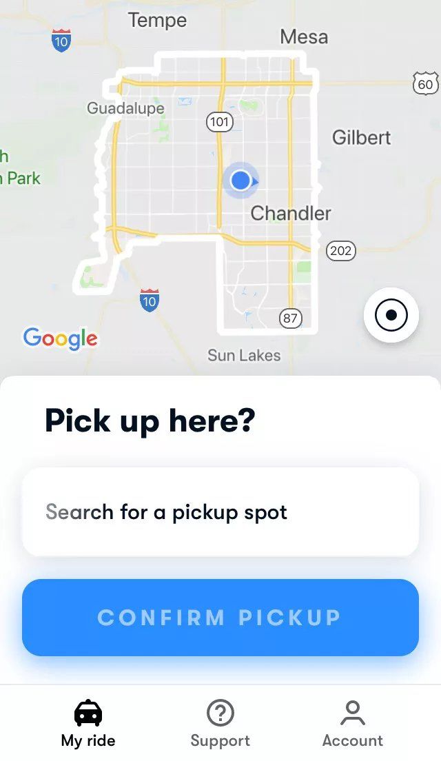 这表明,Waymo 的技术虽然先进,但仍没有为进入现实世界做好万全准备。针对上述我们最好奇的一些问题,Metz 分享了几张 Waymo One 应用程序中的截图。其中,有几张显示了服务区域的地理位置以及一些辅助功能。