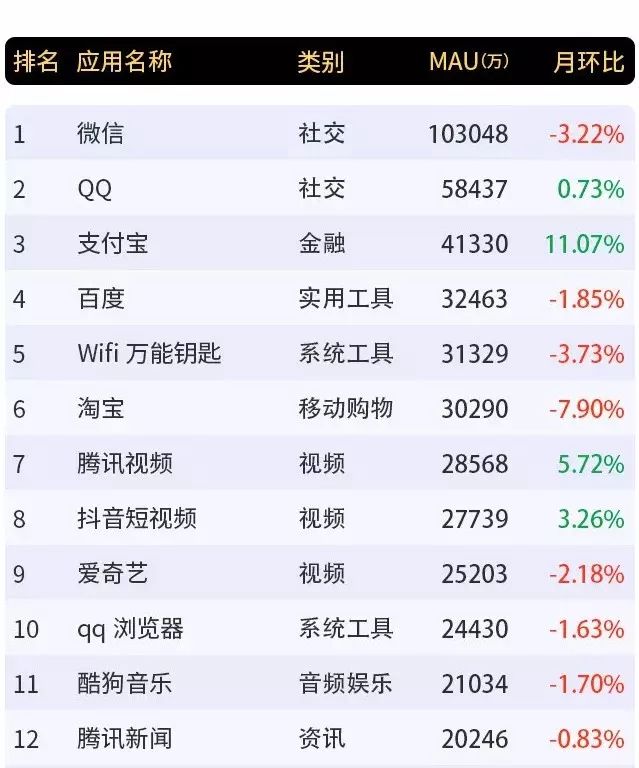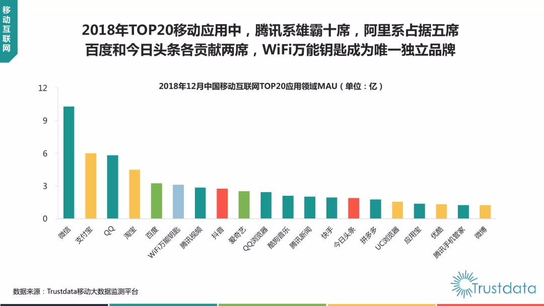 在Trustdata1月10日发布的《2018年12月移动互联网全行业排行榜》中,12月TOP200 App排行榜前10分别是:微信、QQ、支付宝、百度、wifi万能钥匙、淘宝、腾讯视频、抖音、爱奇艺和QQ浏览器。