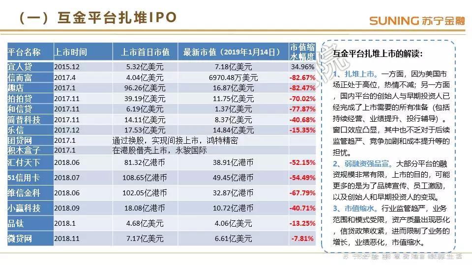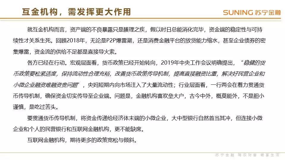 平台转型与发展方面:宏观层面有了宽松的信号,但行业层面的分化趋势依旧会加速,于单个的平台而言,2019年的核心战略目标,依旧是“先活下去,再争取活得好一点”。收缩不必要的支出,聚焦核心业务与核心能力建设,稳固核心团队力量,储备更多的粮草,野心小一点,活下去并不难。成功不是谁曾经做得最大,而是谁活到了最后。