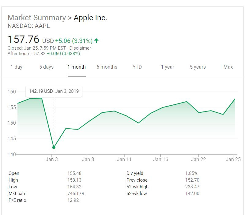 但随后其股价逐渐收复失地。至1月25日收盘时止,苹果股价回升至157.76美元。
