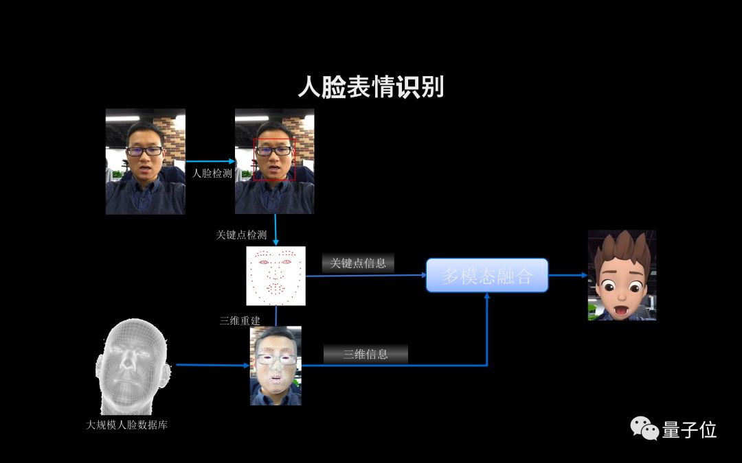 这里需要通过2D的RGB视觉信息对问题进行建模求解,获得人脸关键点和实时重建的3D模型,把各种模态信息做建模、做对齐,求解出人脸的表情,驱动虚拟卡通形象做各种逼真的动作。