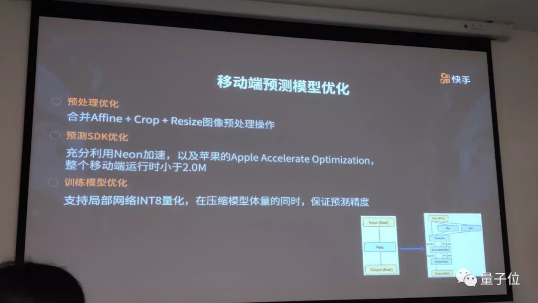 快手技术团队介绍,为了让模型在手机端流畅运行,需要进行图像预处理,合并多种预处理操作,对预处理的图像内存进行统一分配和回收,利用NEON加速和苹果自带的accelerate加速,让运行库只占2M的空间。