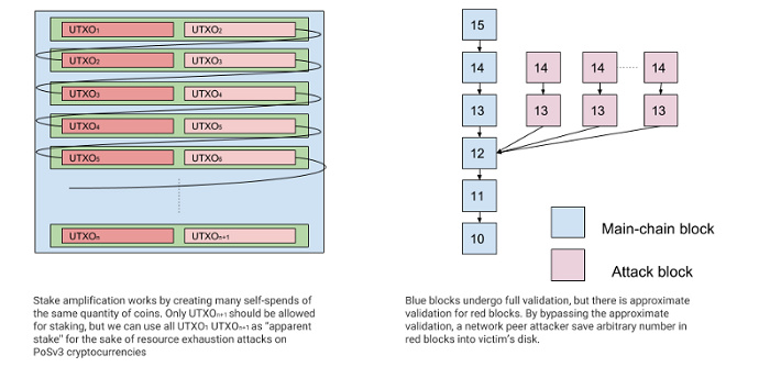 我们将这些被发现的漏洞称为“虚假权益”攻击,从本质上来说,这些漏洞是因为 PoSv3(权益证明版本3)实施的时候,在提交宝贵资源(磁盘和 RAM)之前无法充分验证网络数据,结果会造成一些没有太多权益 (在某些情况下甚至根本就没有权益)的攻击者可以通过制造虚假数据填充磁盘或 RAM,这样就会导致节点崩溃。我们认为,所有基于 UTXO 和最长链权益证明模式的加密互补都很容易受到这种“虚假权益”的攻击,而且会把本次调研中涉及潜在影响的加密货币清单列在文末。