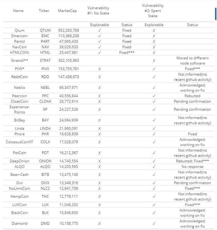 下表是我们认为受到上述两个漏洞影响的加密货币列表,现阶段,我们尚未对全部加密货币(可能有上千个)验证相关漏洞,而且还没有检查那些声称不受漏洞影响的权益认证加密货币为何不受影响。