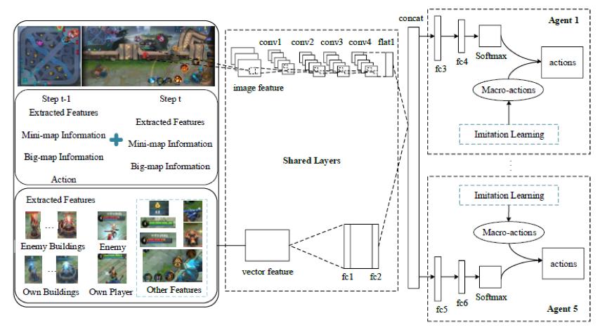“vivo AI Lab”则选择了用另外一套深度学习网络来捕捉《王者荣耀》中5个英雄的特征,具体的来说,就是把5个英雄对应的大地图和小地图数据,通过卷积神经网络提取信息,结合多目标检测提取的特征向量,再输入到上文所提到的分层神经网络当中。然后各个英雄根据自身状态环境,决策出不同的动作,实现在各自情况下的对应操作。