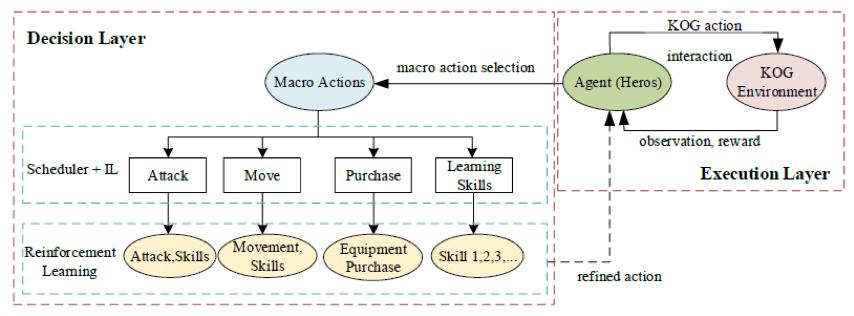在本次对《王者荣耀》挑战的背后,“vivo AI Lab”专门提出并使用了一种全新的分层强化学习模型。这种神经网络模型既能够通过模仿人类来制定宏观策略,同时还能根据强化学习来保证微观操作。尤其适应即时战略游戏(RTS)对于操作的需求。