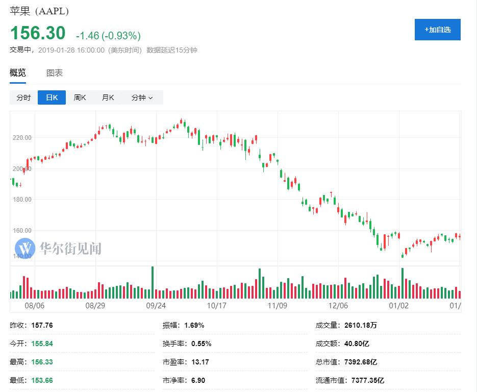 本周一,受英伟达大幅下调营收指引和卡特彼勒财报逊色影响,美股低开低走,苹果股价同样下挫,盘中一度跌约2.6%,午盘跌幅收窄,最终收跌0.93%。