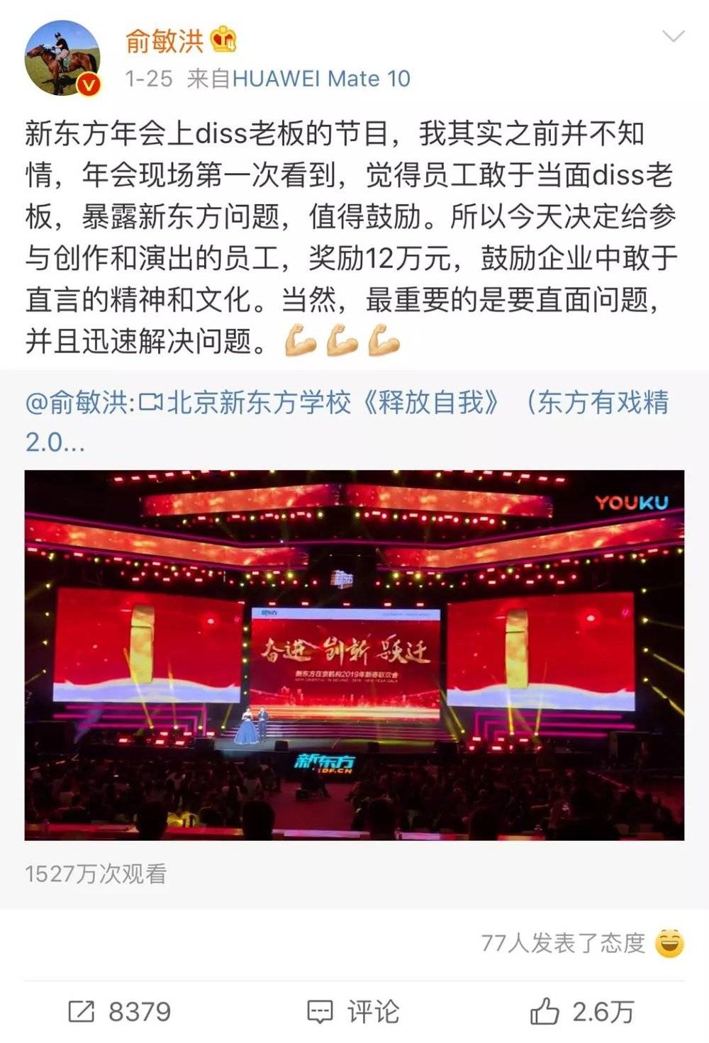 “员工敢于当面diss老板,暴露新东方问题,值得鼓励。所以今天决定给参与创作和演出的员工,奖励12万元,鼓励企业中敢于直言的精神和文化。”表演结束后,俞敏洪转发了现场视频,并留下了上面的言论。他已经意识到,自己必须从对商业成功的崇拜中抽离,重新树立新东方的风气。这不像商人的做法,更像一个校长,敢于拍桌子,敢于自我革命。