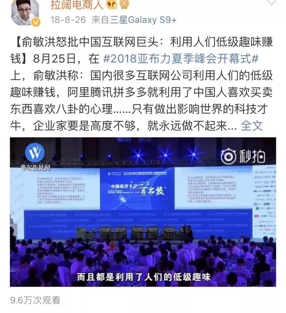 参加活动时,俞敏洪代表着商业精英,不过他的表现并不精英。在焦虑的驱使下,他失去了对自己言论的克制与约束,失去了在商言商的沉着与冷静。这些调侃戏谑可以在封闭的空间发泄,却决不能在公众面前挑战所有人的接受底线。