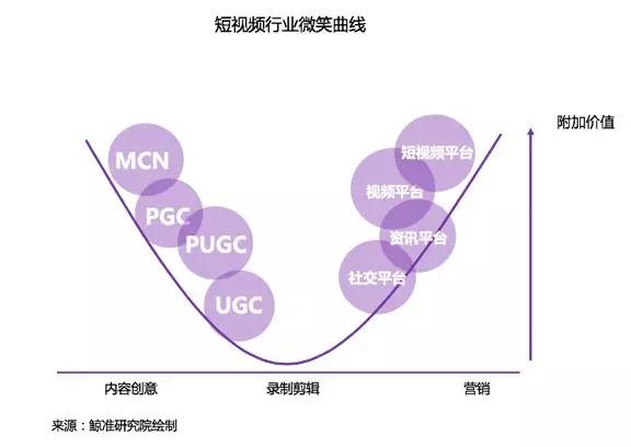 对于短视频行业中各个角色附加价值以及未来方向的发展,我们将用于评判传统行业策略方向的“微笑曲线”进行套用。将短视频视为产成品,即要增加企业附加价值,绝不是持续在拍摄、录制、剪辑的底部位置,而是往左端内容创意以及整合或右端营销及建立品牌效应方向发展。