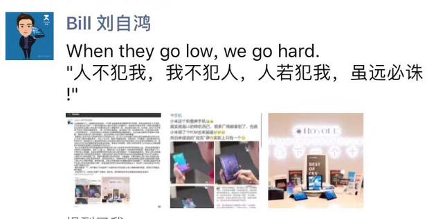 此前,小米双折叠手机亮相,柔宇CEO刘自鸿在朋友圈中表示,“When they go low,we go hard.”刘自鸿还说:“人不犯我,我不犯人,人若犯我,虽远必诛”。
