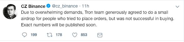 币安创始人赵长鹏在推特表示,由于需求量巨大,Tron 团队宣布为那些试图下订单但未成功购买的人提供一个小型空投,具体数字将很快公布。