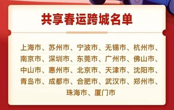 目前参与哈啰出行共享春运跨城的城市名单已经达22个,基本囊括了当下核心的春运人口流出地城市。