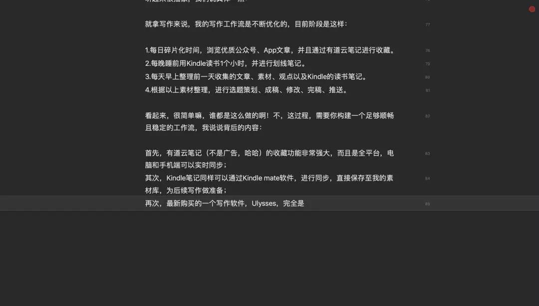 再次,最新购买的一个Mac端写作软件,Ulysses,完全是一个沉浸式写作系统的典范,大家看我的写作页面,全黑屏,仿打印机效果,没有任何打扰,可以让我迅速进入专注的写作状态;