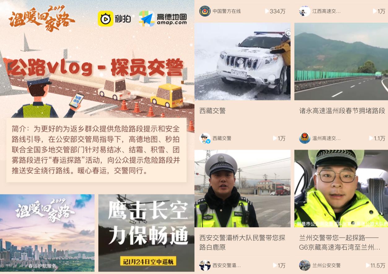 对老百姓而言,平安回家是每年年底的最大心愿,据公安部发布的春运交通安全预警,今年春运期间,车流集中,部分地区可能出现大雨、大雪、大雾等恶劣天气,交通情况复杂。为更好服务春运,及时为返乡群众提供危险路段提示和安全路线引导,传递春运相关资讯服务旅客,1月28日,秒拍联合高德地图发起了“春运探路vlog”活动,各地交警提前进行路面探测并采用vlog的形式生动记录了交警执勤探路的全部过程,通过“短视频+”的形式提供更好的路况预警提示,同时通过高德地图的“智慧诱导”功能为返乡群众规划“交警推荐”的安全路线,助力数以十万计的人民群众安全返乡。