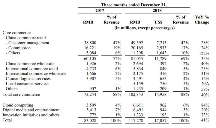 包括淘宝、天猫等在内的核心电商在本季度继续扮演集团大哥的角色,并有增强趋势。
