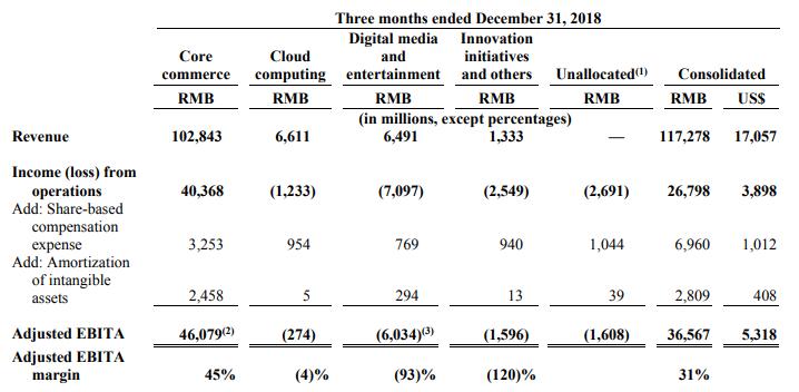 阿里巴巴各业务版块2018年9月-12月的经营利润及亏损状况