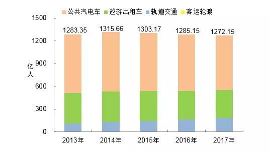 2013-2017年全国城市客运量;图片来源:《2017年交通运输行业发展统计公报》插图
