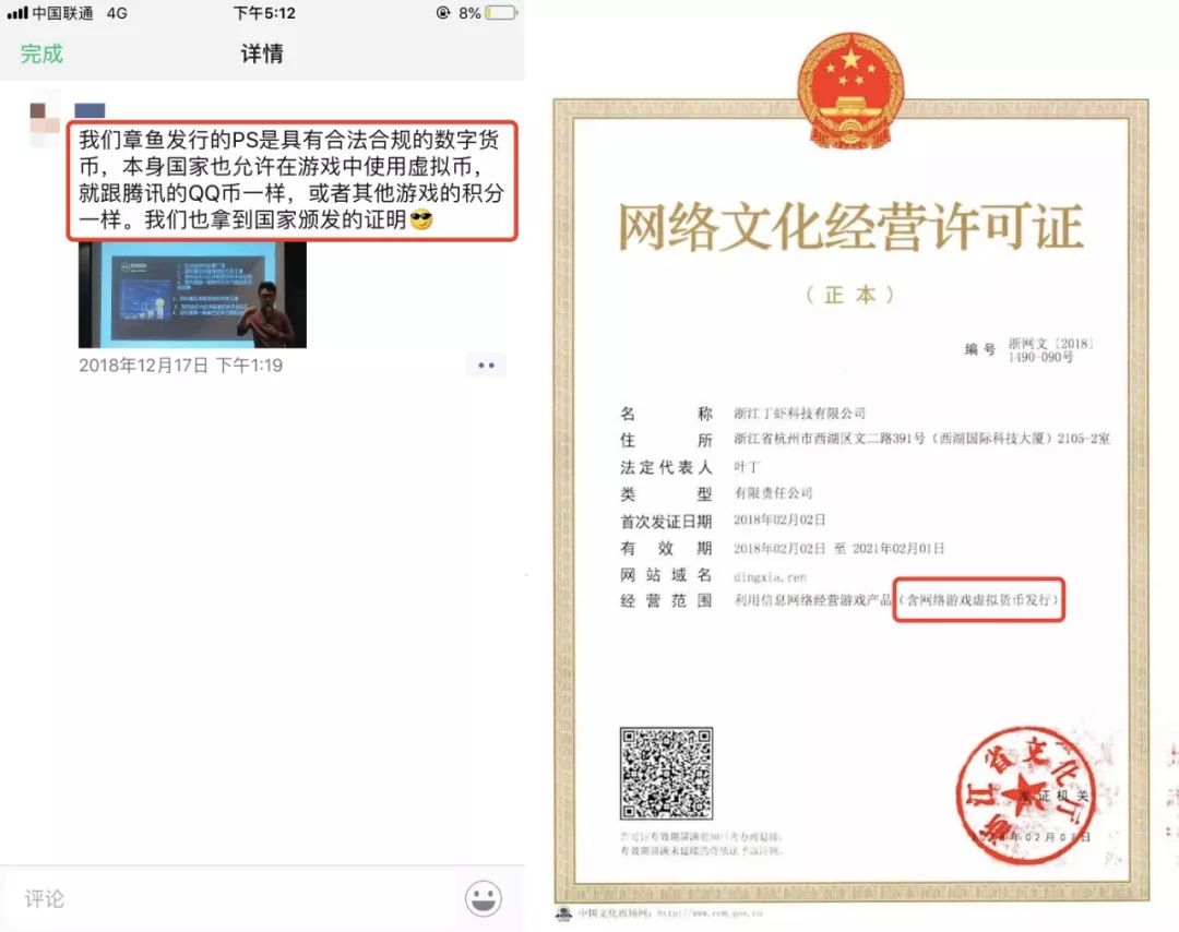 “我们章鱼是首个获得合法虚拟货币发行资质的团队,几乎是完全合法的。”浙江丁虾科技有限公司获得的网络文化经营许可证,也是章鱼娱乐的代理对外输出宣传其项目的关键信息之一。