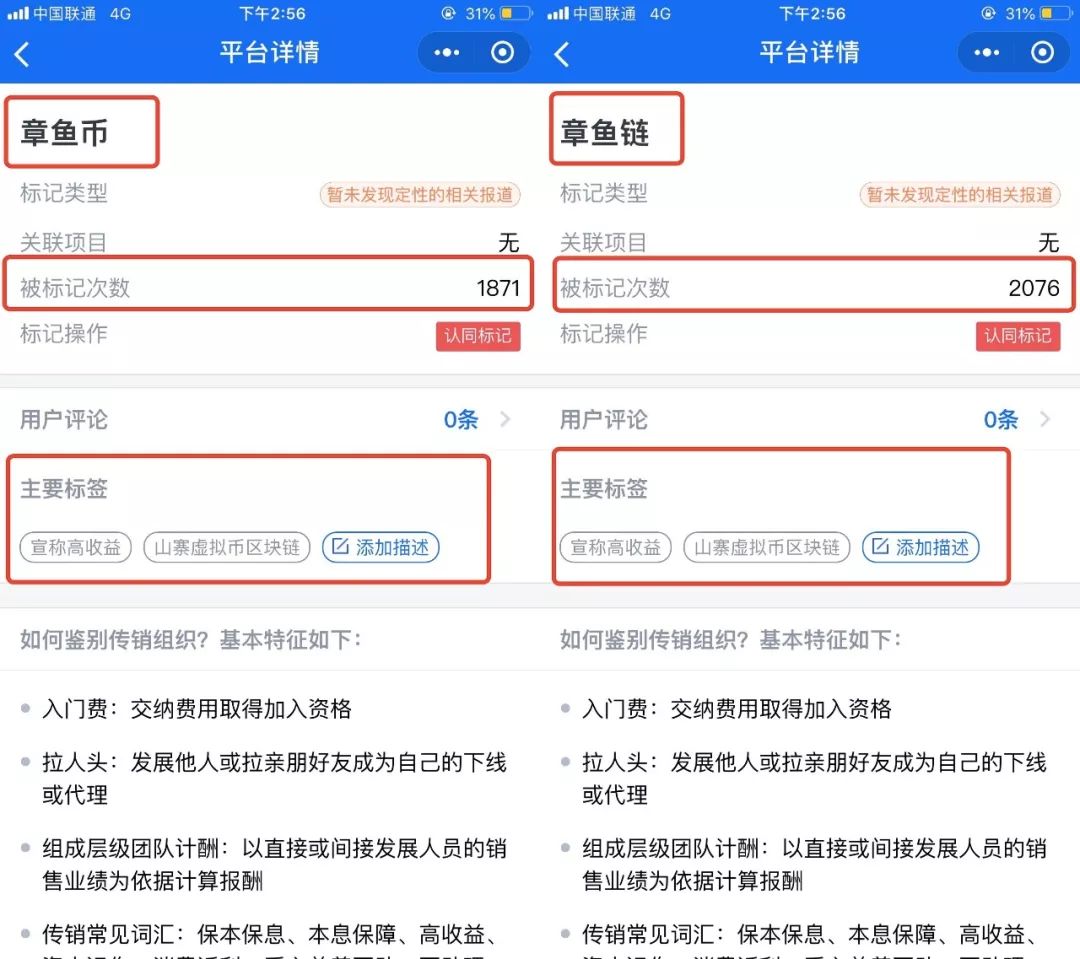 近日,反金融欺诈普惠 APP 菲凡烽火台发布调查简报称,章鱼娱乐的运用模式已经涉嫌传销。 Odaily星球日报通过腾讯此前推出的传销项目自查小程序发现,与章鱼娱乐相关的章鱼币、章鱼链等项目分别被用户标记了 1871 次及 2076 次。