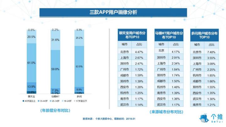 三款应用中,多闪明显主打年轻用户,而聊天宝的奖励措施又偏向于用户下沉策略,马桶 MT 的用户定位比较模糊,不过数据分析显示,三款应用的用户特征较为相似,均以男性、25-34 岁的 85 后工作人士为主,且主要分布在北上广深等一线城市,但多闪的用户对抖音和今日头条的使用明显多于聊天宝,可见头条系产品对多闪起到了重要的导流作用。