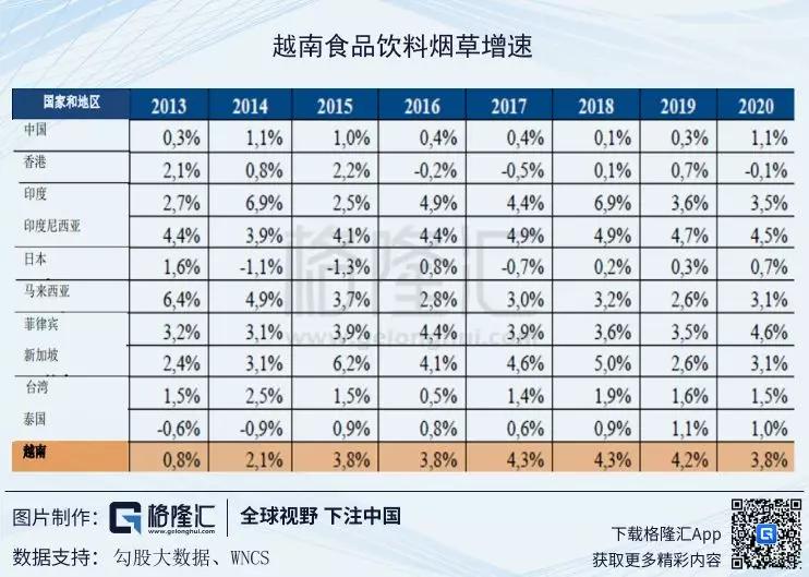 (越南食品饮料烟草增速,数据来源:WNCS)