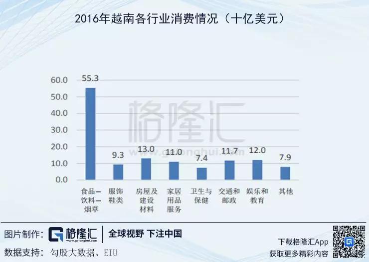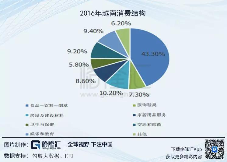 食品饮料行业占越南消费结构最大份额,根据2016年的数据显示,食品饮料烟草占居民总消费的43.3%。