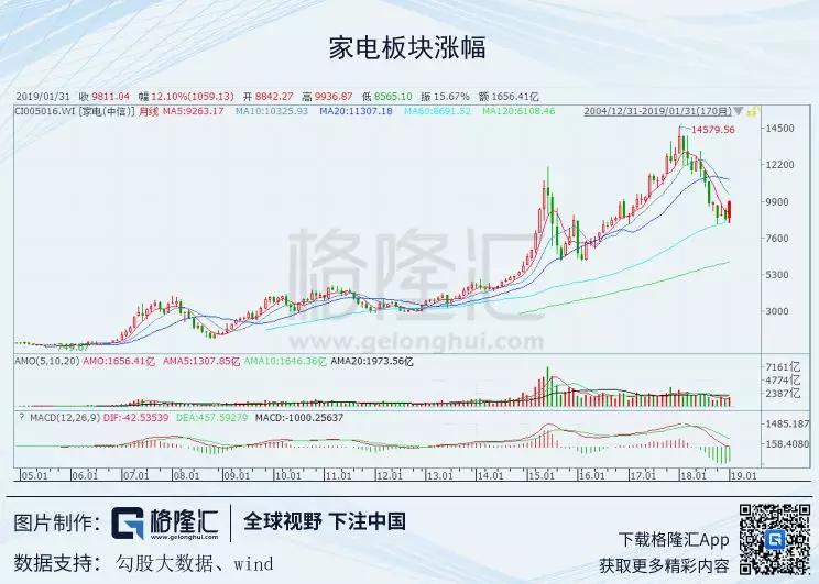 如图所示,过去15年,整个家电板块最高时上涨了10倍,现在A股处于史上“最低估值熊市”的时候,家电板块依旧有接近10倍的涨幅。
