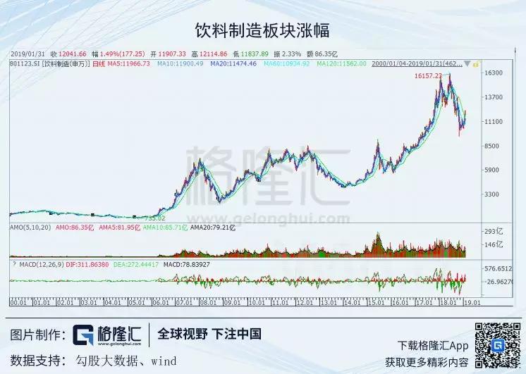 再看饮料制造板块,18年里整个板块最高涨幅达到16倍之余,现在处于12倍左右。