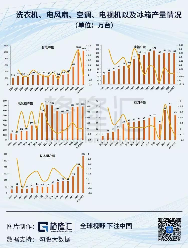其中,洗衣机、电风扇、空调以及电视机产量的增长较为突出。2017年洗衣机、电风扇、空调以及电视机的产量分别为 285 万台、683 万台、45 万台和 1043万台。