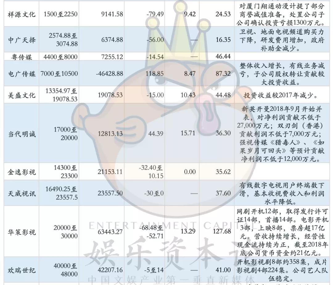 据娱乐资本论不完全统计,截至2019年1月31日晚间,至少有30家影视传媒板块上市公司披露了2018年业绩预告,其中只有当代明诚、中国电影、光线传媒和电广传媒4家明确实现盈利正增长,却有10家预计将录得10个亿以上的亏损,