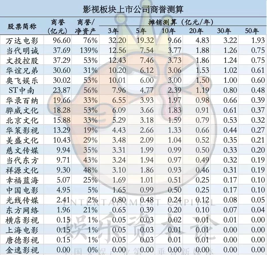 A股截至去年三季度末商誉1.45万亿,若按10年摊销,每年将多出1450亿亏损;若按20年摊销,则每年多出约725亿亏损。很多公司业绩根本跑不赢商誉摊销,那么将面临着连年亏损、最后退市的结局。尤其是对于影视公司、新经济企业而言,大多是轻资产+高估值。以往影视公司因并购产生高额商誉屡见不鲜。