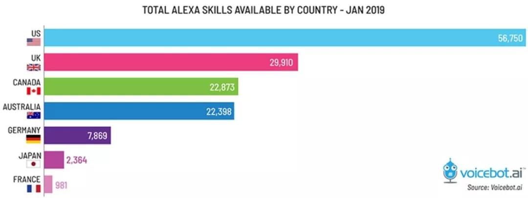 根据 Voicebot 公布的最新数据,美国的亚马逊Alexa智能插件数量在2018年翻了一番,而 Alexa的另外两个主要市场,英国和德国,智能插件数量也分别增长了233%和152% 。