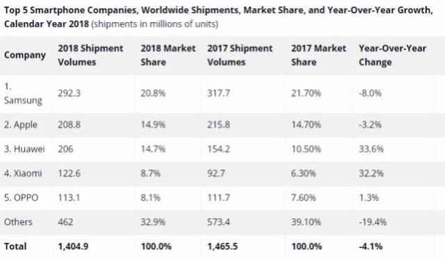 但是根据目前的IDC报告指出,2018年苹果尽管市场份额下滑了3.2%,但iPhone销量以2.088亿部位居全球第二名,华为全年出货量为2.06亿台,市场份额为14.7%,同比增长33.6%。这意味着苹果在库克任期内最大的低潮期——销量依然超越了华为。