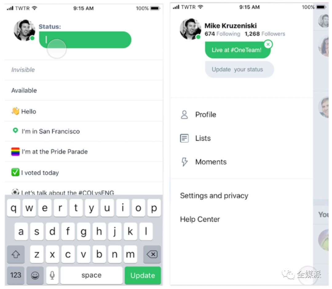 第三个是状态指示器。Twitter有两种选项,第一种很传统,用户可以看到各个账号的上线时间。第二种更加注重细节的补充,用户可以知道别人在做什么,比如通过状态的更新表明自己在其他城市旅行。