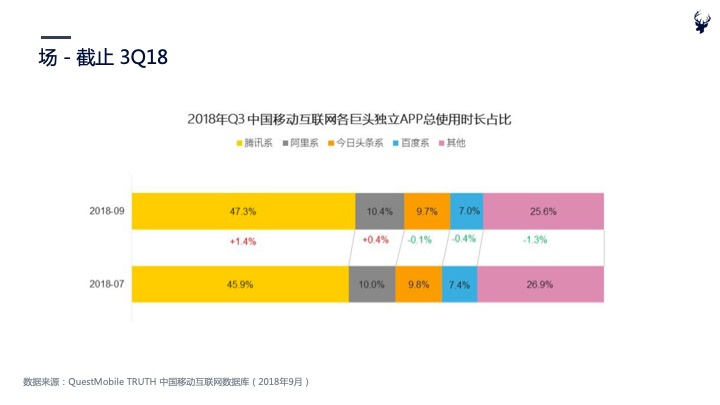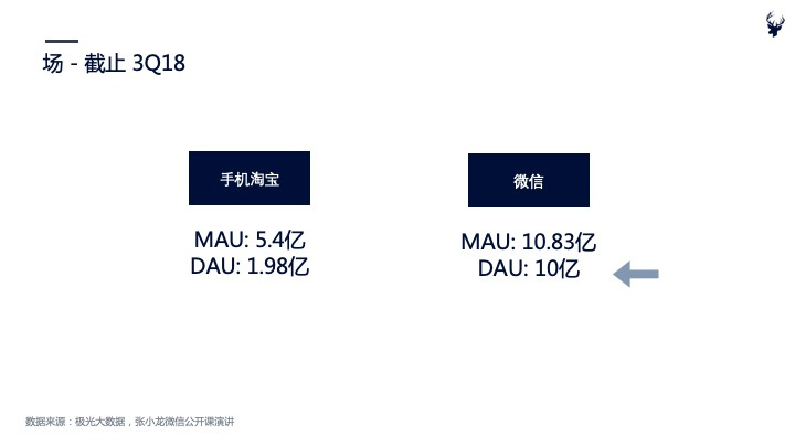 2017年9月到2018年9 月,移动互联网人群基本没有变化,除了一个人群出现了45% 的增长,那就是小镇青年。小镇青年的定义是三四线及以下城市的90后。所以下沉市场,几乎就是微信互联网,