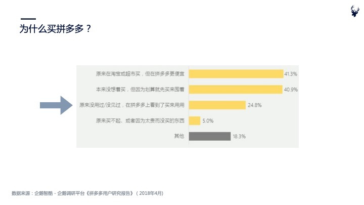 不仅天猫这样的品牌电商,愿意去为了新品做一些战略的调整,连拼多多很大一部分营业额也是新品驱动的。有一个用户调研问道,在拼多多购买的商品类型有哪些,25%的用户说:“原来没用过/没见过,在拼多多上看到了买来用用”。