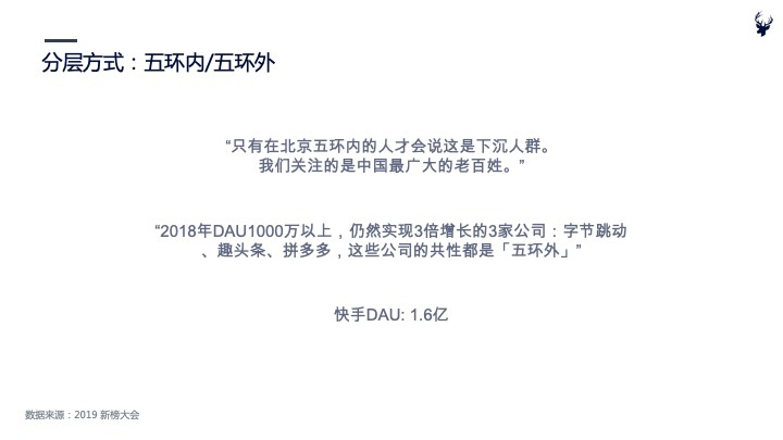 前两天新榜大会,趣头条的COO 说:”2018年DAU1000万以上,仍然实现3倍增长的3家公司:字节跳动、趣头条、拼多多,这些公司的共性都是「五环外」。“ 同一场大会,快手公布最新DAU,是1.6亿。但为什么”五环外“ 这两年突然兴起了?这就样谈到场的变化。