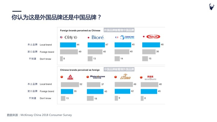这很有意思,因为麦肯锡之前做过一个覆盖全国sample size 10000人的一个调研,他们问消费者这些品牌是国内还是国外的,大部分人不太能分得清。有人觉得碧柔、达能、养乐多是国内的品牌,美特斯邦威是国外的品牌。那我就觉得很奇怪了,既然分不清国货洋货,为什么会出现国货潮?