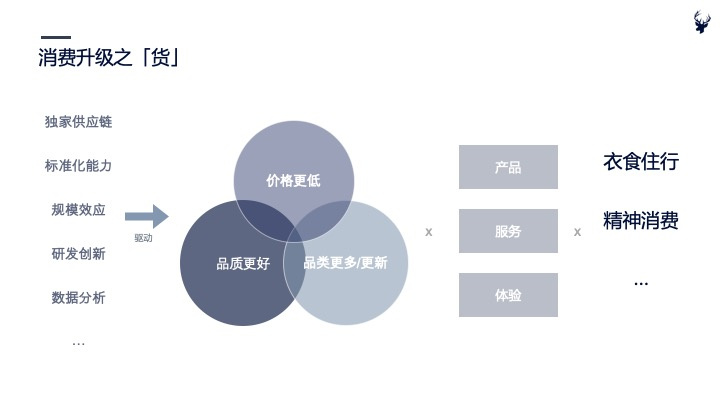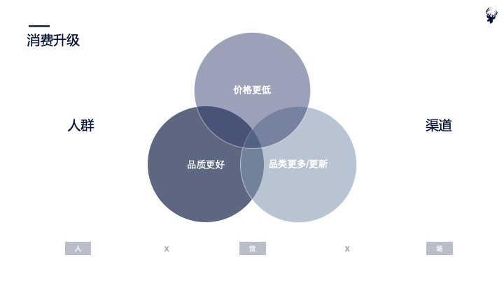 借用一个大家比较熟悉的框架来讲:零售的「人货场」开始。我近一步把货拆分为价格、品质和品类。我觉得讲消费的时候大家最容易想起来的是一个更好的产品,所以我从货开始。
