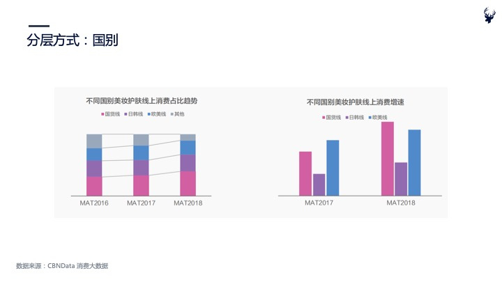 除了收入,最近在护肤、美妆品类比较流行的一个分层方式是国别。护肤彩妆品分成国货线、日韩线、和欧美线。我记得三四年前,还挺流行海淘的,但最近比较热的是“国货兴起”,2018年被称之为国货彩妆元年。确实,如果从数据来看,这几年国货占比最大,2018年增速也超过了欧美线。