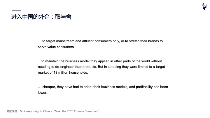 进入中国,这些品牌可以选择继续服务富裕人群,全球的商业模式和产品就不用改,但这部分在中国只有1800万个家庭。它也可以选择服务1.8亿家庭的主流市场,但这意味着产品需要降价、模式需要更改、利润率也会更低。大部分品牌在进入中国之后选择不变。